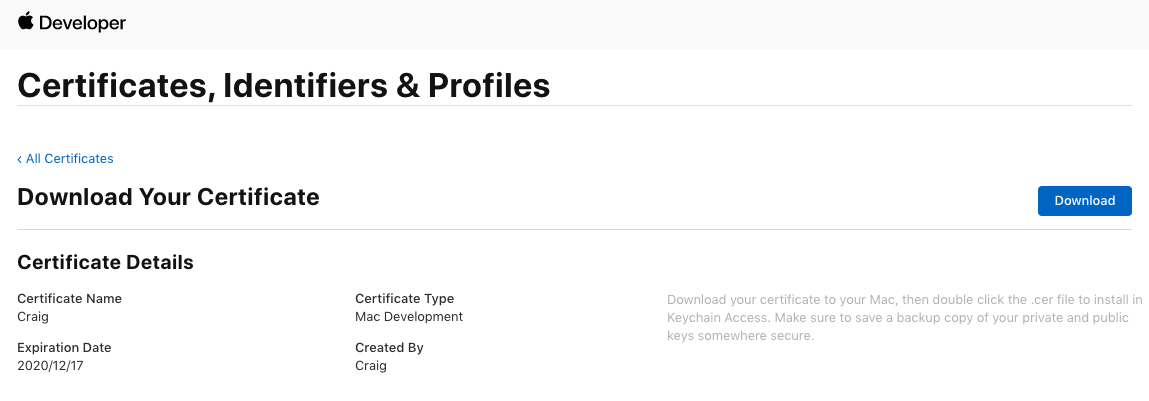 Click Download to get your certificate and double-click to install it in the Keychain: