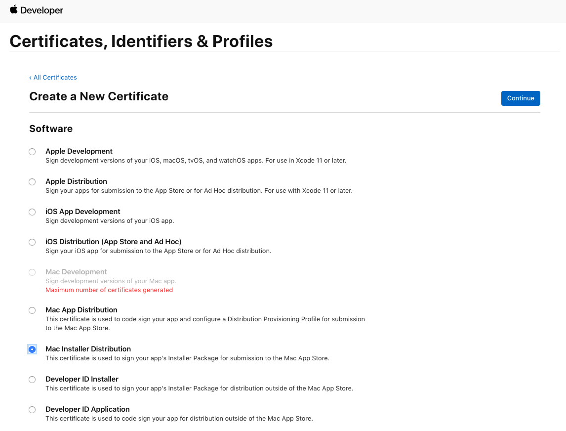 - Developer ID Installer – Certificates for the installer to distribute outside the Mac App Store.