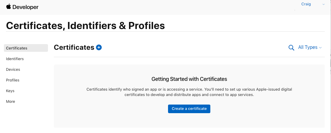 Use the Certificates section to create several different types of certificates that will be used to sign Mac Applications: