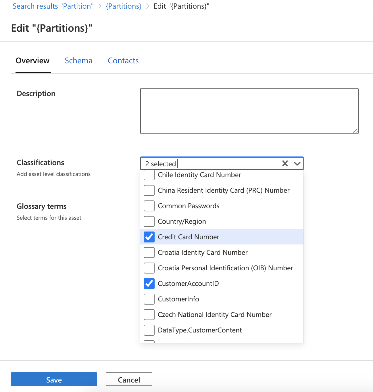 From the Classifications drop-down list, select the specific classifications you're interested in. In our example, we're adding Credit Card Number, which is a system classification and CustomerAccountID, which is a custom classification.