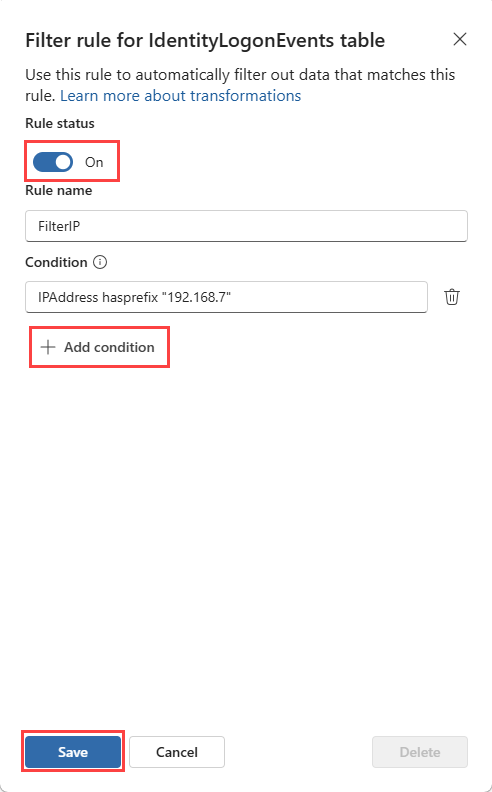 Filter transformations enable you to reduce noise by discarding data during ingestion that isn't useful for investigations. Use a filter transformation rule to specify a KQL condition that determines which data to filter out, with the remaining data sent to the Analytics tier.
