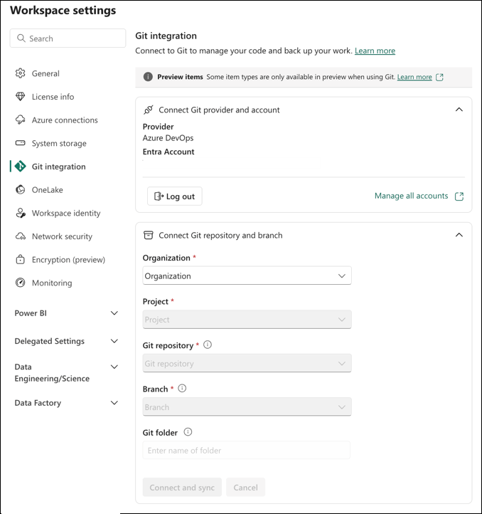- Users can synchronize workspace items with their Git repositories