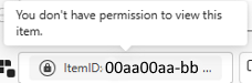 View item reference additional details in the Variable library page (UI only) Users with access to the Variable library (WS viewer or higher) who lack permissions for the item in the referenced item variable, won't see their details in the UI. Instead, they'll see the item ID accompanied by a hover message, rather than the details component.