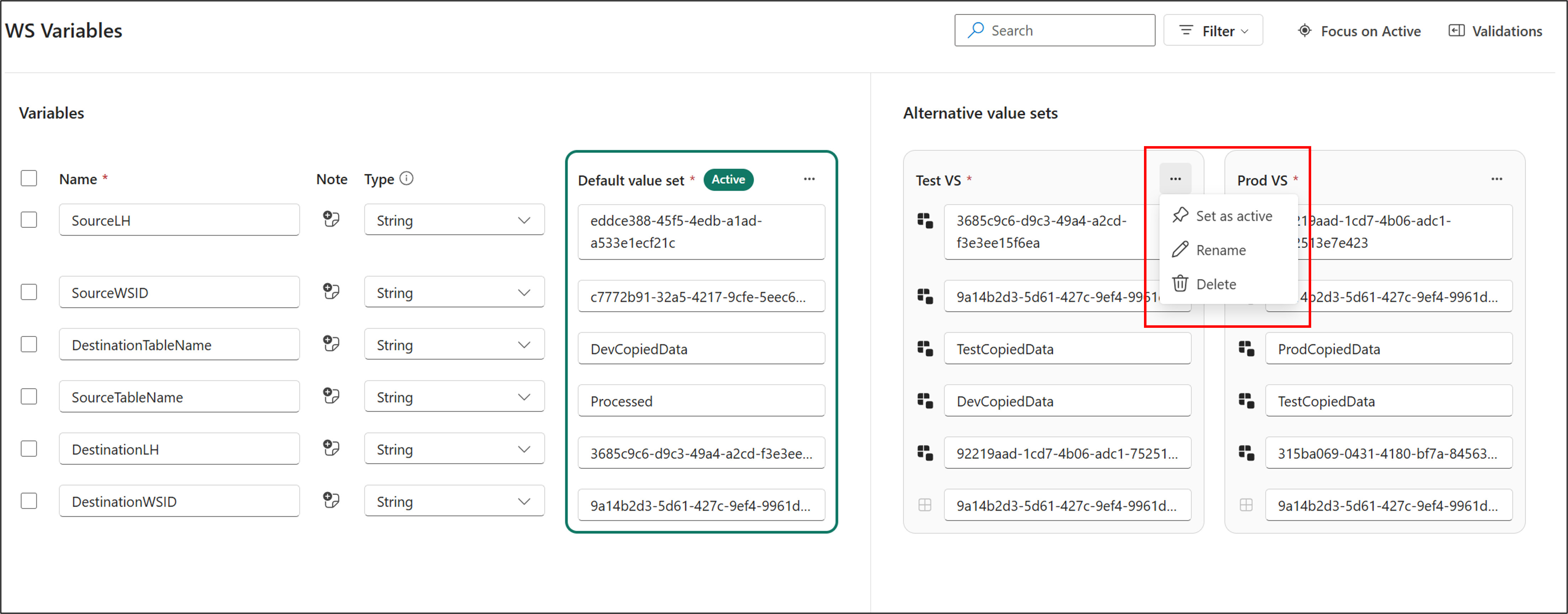 - There's always one (and only one) active value set in a variable library at a time. You can't delete a value set while it's active. To delete it, first configure another value set to be active. You can have a different active value set for each stage of a deployment pipeline.