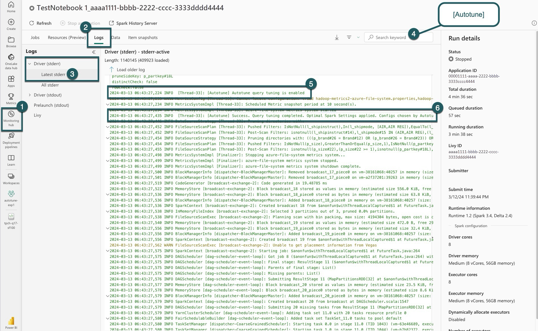 For each of your queries, autotune determines the most optimal settings for three Spark configurations. You can view the suggested settings by navigating to the logs. The configurations recommended by autotune are located in the driver logs, specifically those entries starting with [Autotune].