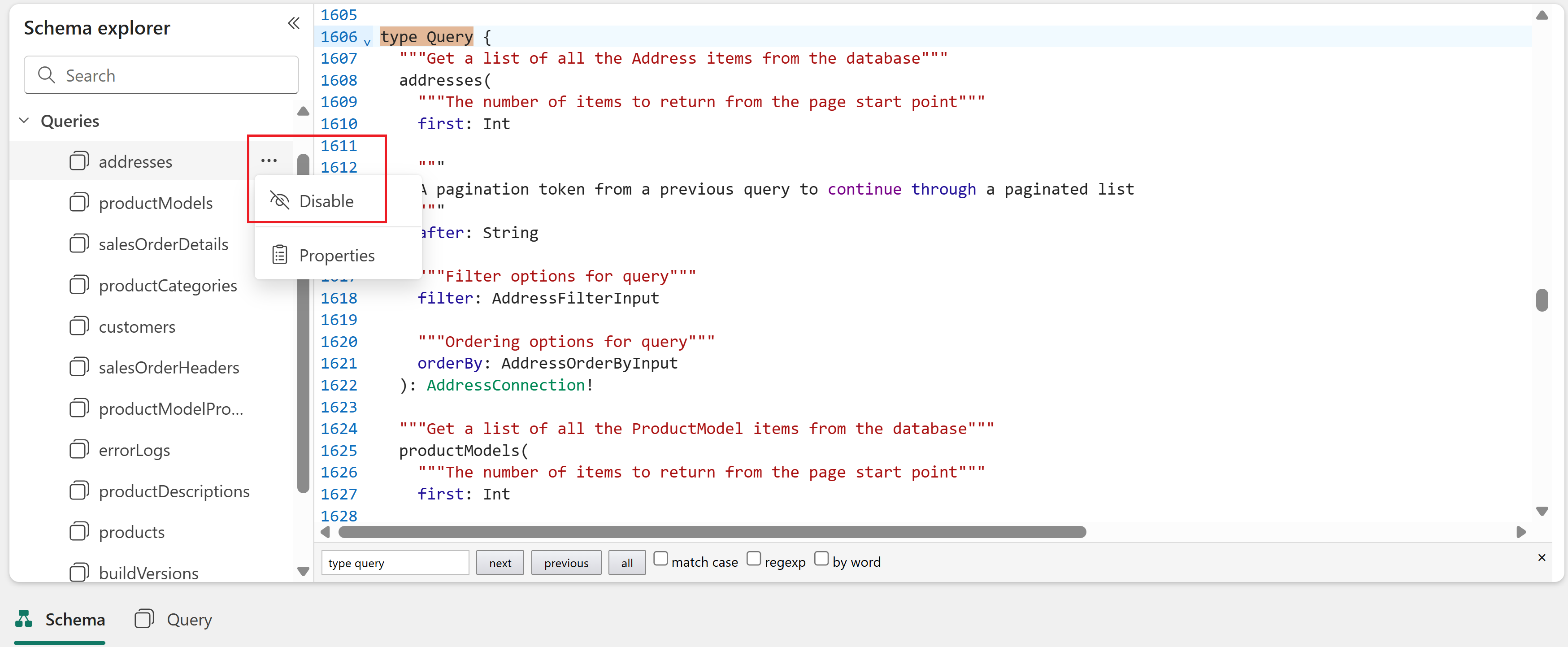 The Schema explorer in the left pane lets you navigate and inspect all the objects in your API. The explorer is available in both the schema view and the query editor, making it easy to explore your API structure while writing queries.