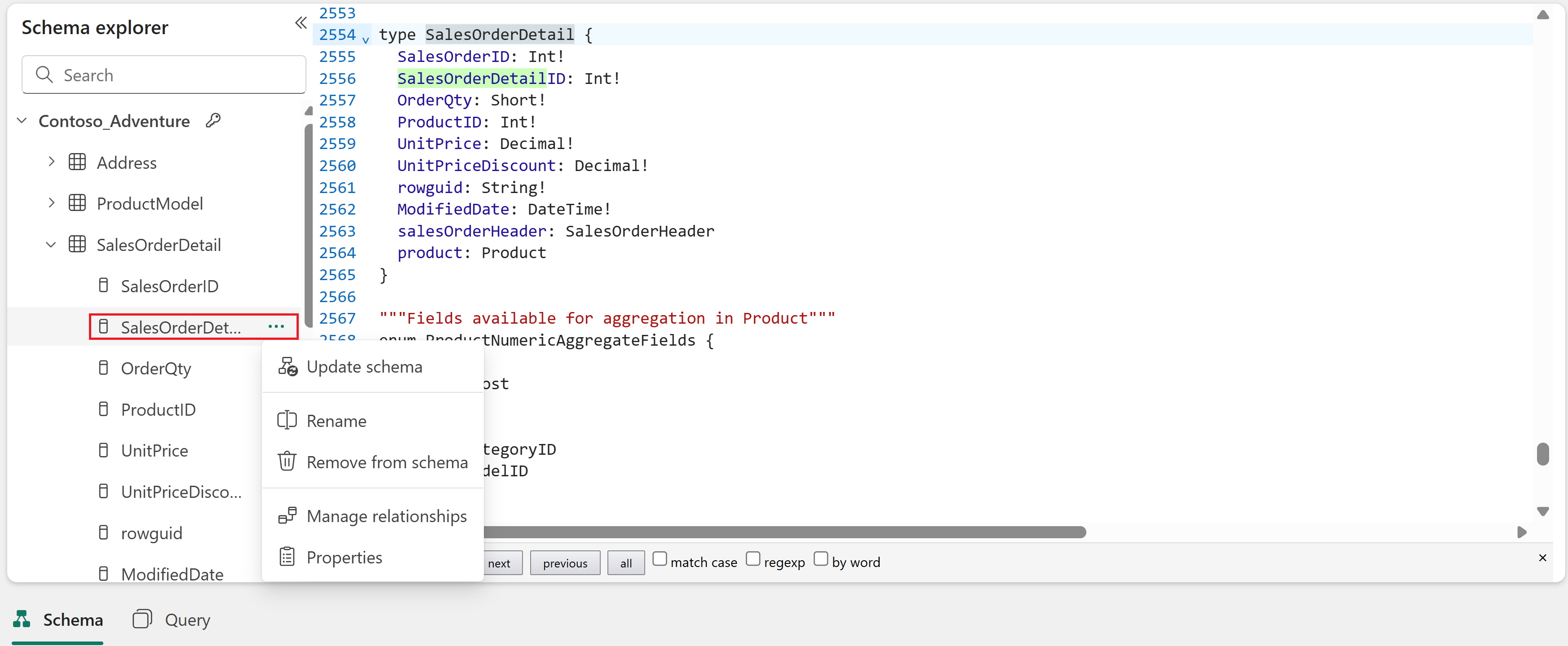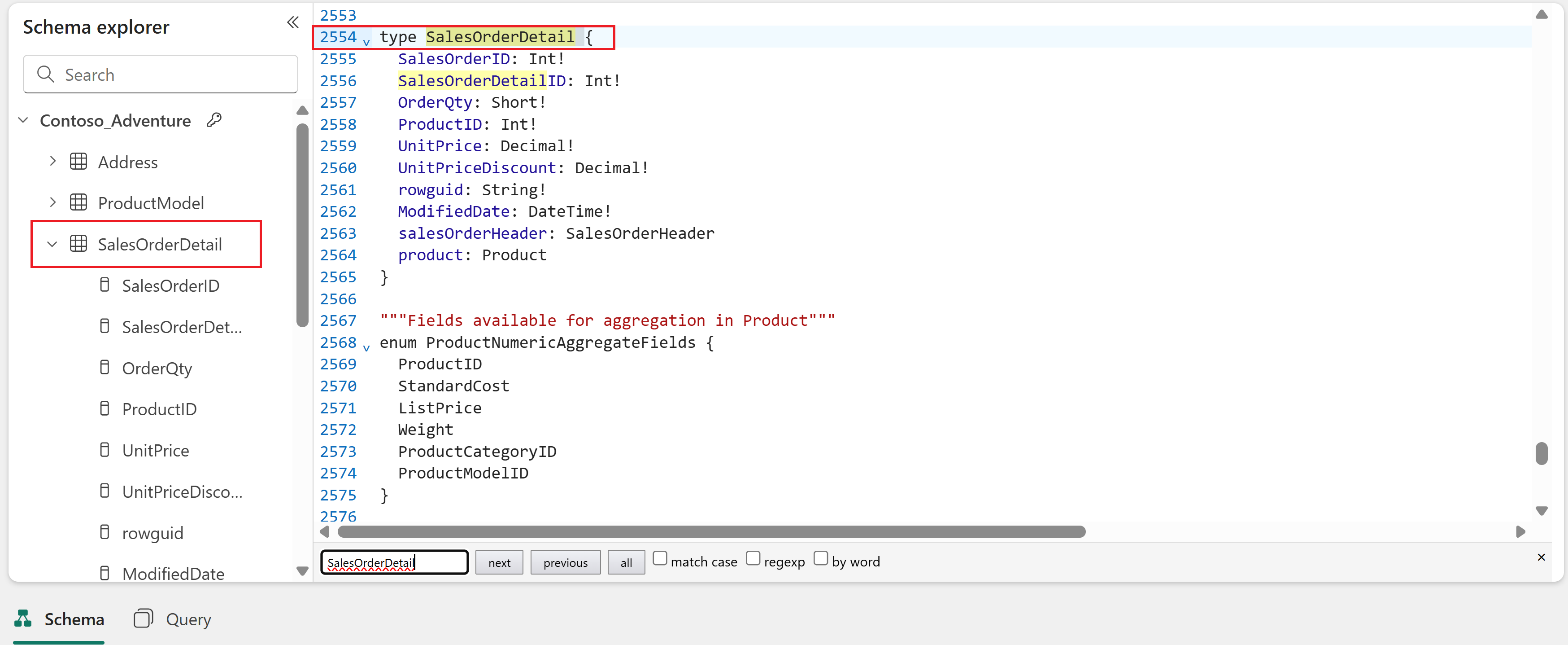 Types represent the structure of your data and appear under the name of the data source from which they were generated. The following image shows the SalesOrderDetail type generated from the SalesOrderDetail table in the AdventureWorks SQL analytics endpoint: