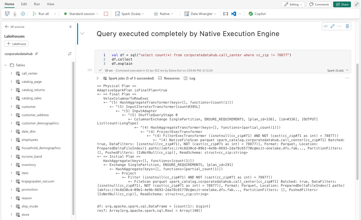 After executing the query in which the native execution engine is disabled, you must re-enable it for subsequent cells by setting spark.native.enabled to true. This step is necessary because Spark executes code cells sequentially.