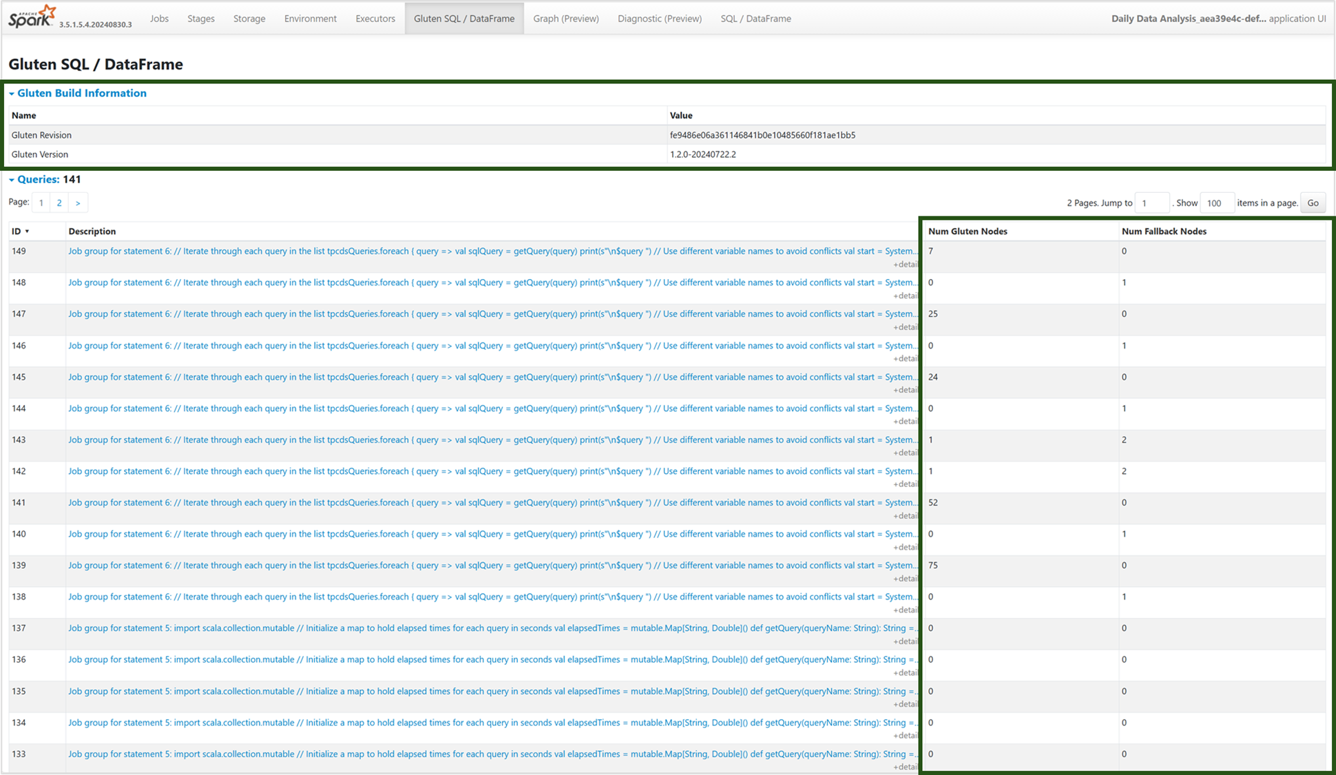 You can navigate to the new 'Gluten SQL / DataFrame' tab to view the Gluten build information and query execution details. The Queries table provides insights into the number of nodes running on the Native engine and those falling back to the JVM for each query.