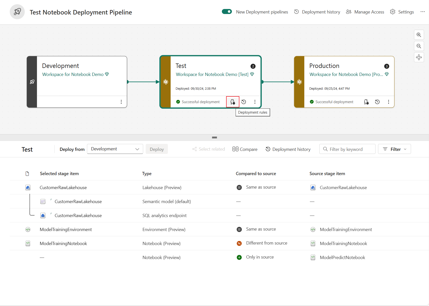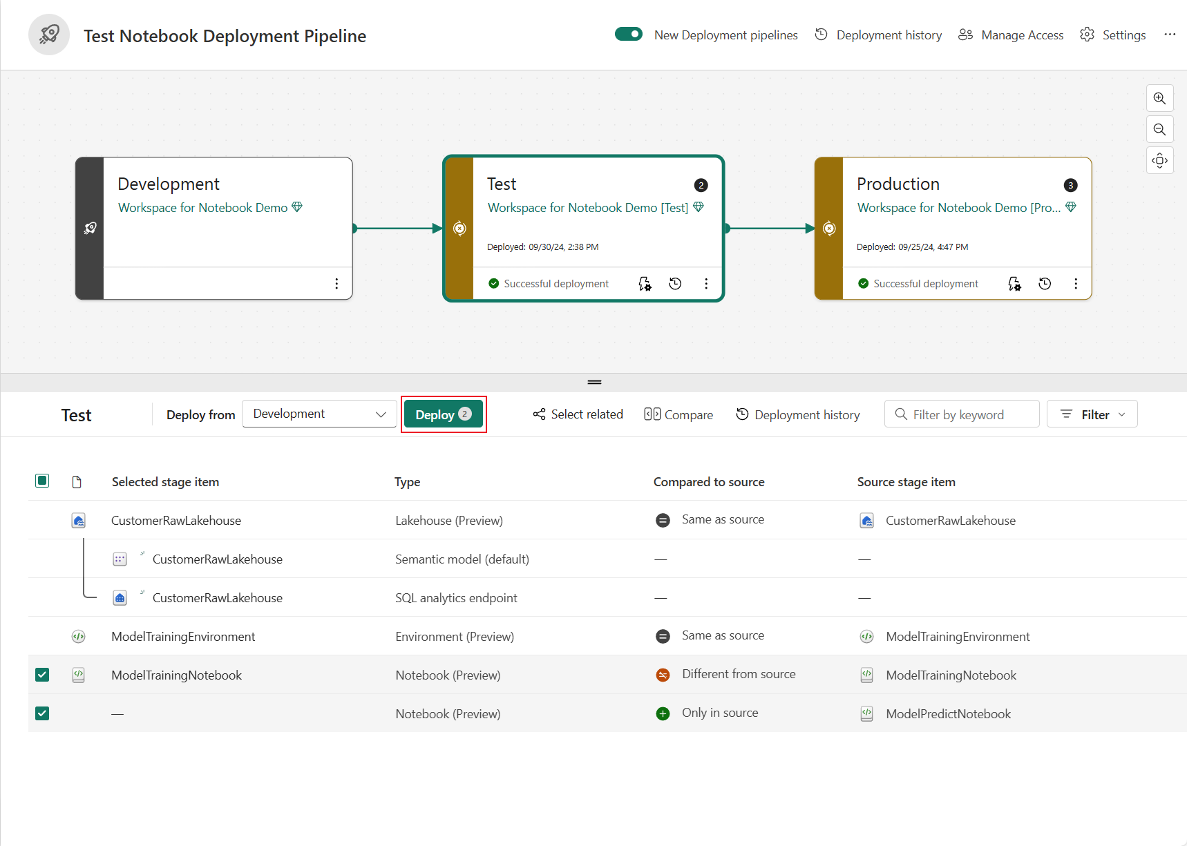 Select Deploy to deploy your notebooks across the Development, Test, and Production stages.