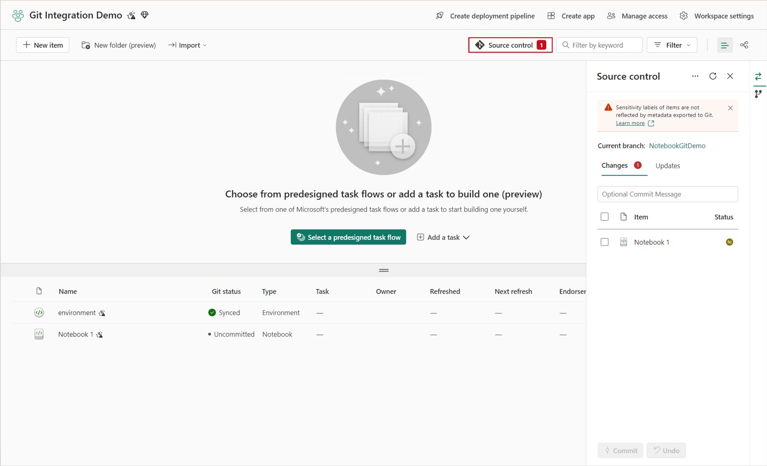 From your workspace settings, you can easily set up a connection to your repo to commit and sync changes. To set up the connection, see Get started with Git integration. Once connected, your items, including notebooks, appear in the Source control panel.