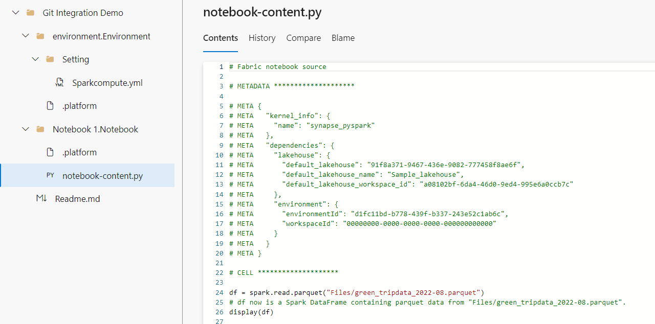 In the item content source file, metadata (including the default lakehouse and attached environment), markdown cells, and code cells are preserved and distinguished. This approach supports a precise recovery when you sync back to a Fabric workspace.