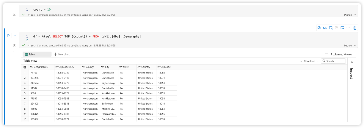 %tsqlin following cells. The line magic will use the connection established in step 1 without requiring you to specify-artifactand-typeagain. For example:df = %tsql SELECT TOP(10) * FROM [ContosoDWH].[dbo].[Geography];