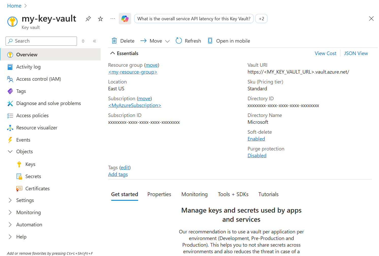 requestsandazure-keyvault-secretslibraries. For more information, see Manage libraries.Go to your Azure Key Vault resource in the Azure portal and retrieve the