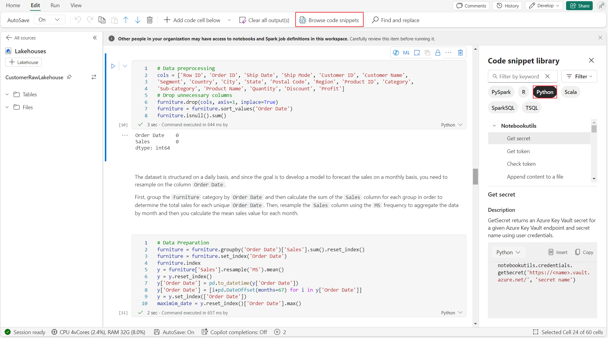 Lakehouse & Resources are natively available: The Fabric Lakehouse together with Notebook built-in Resources full functionality are available in Python notebook. This feature enables users to easily bring the data to python notebook, just try drag & drop to get the code snippet.