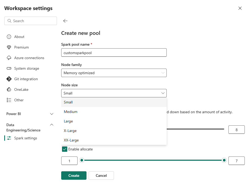 Custom Spark Pool: You can size the nodes, autoscale, and dynamically allocate executors based on your Spark job requirements. To create a custom Spark pool, the capacity admin should enable the Customized workspace pools option in the Spark Compute section of Capacity Admin settings.