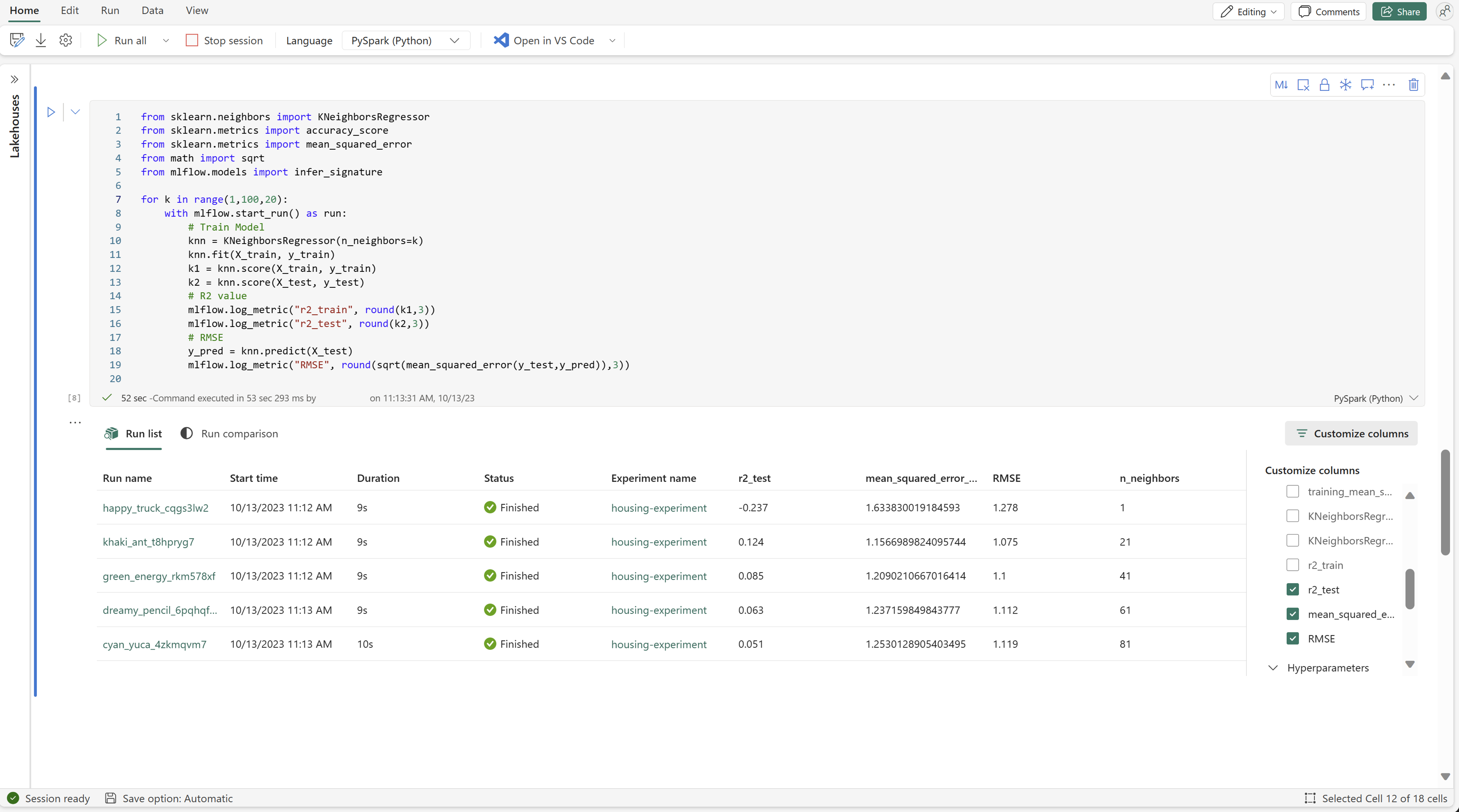 - Customize the columns within the table by expanding the Customize columns pane. Here, you can select the properties, metrics, tags, and hyperparameters that you would like to see.