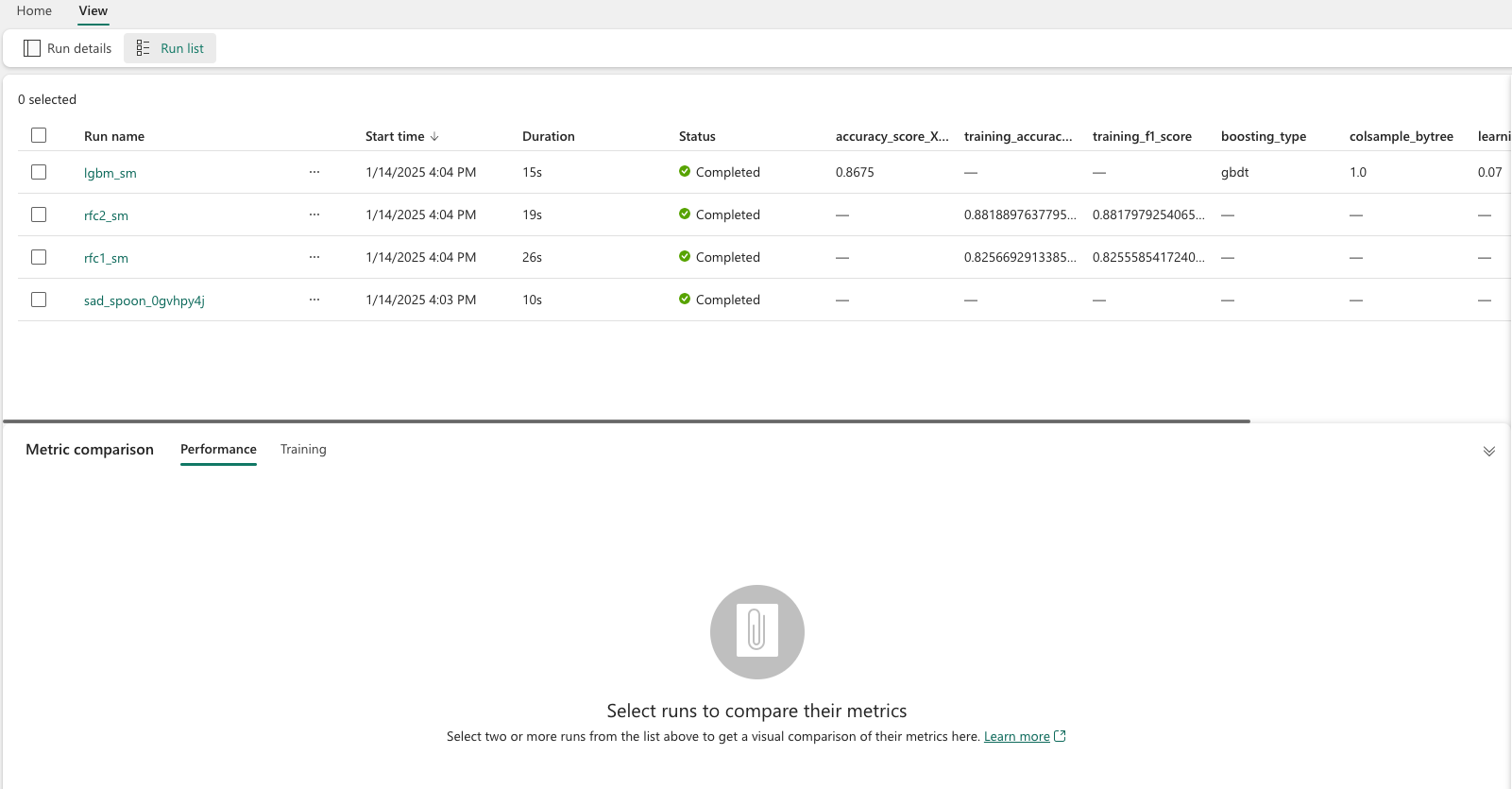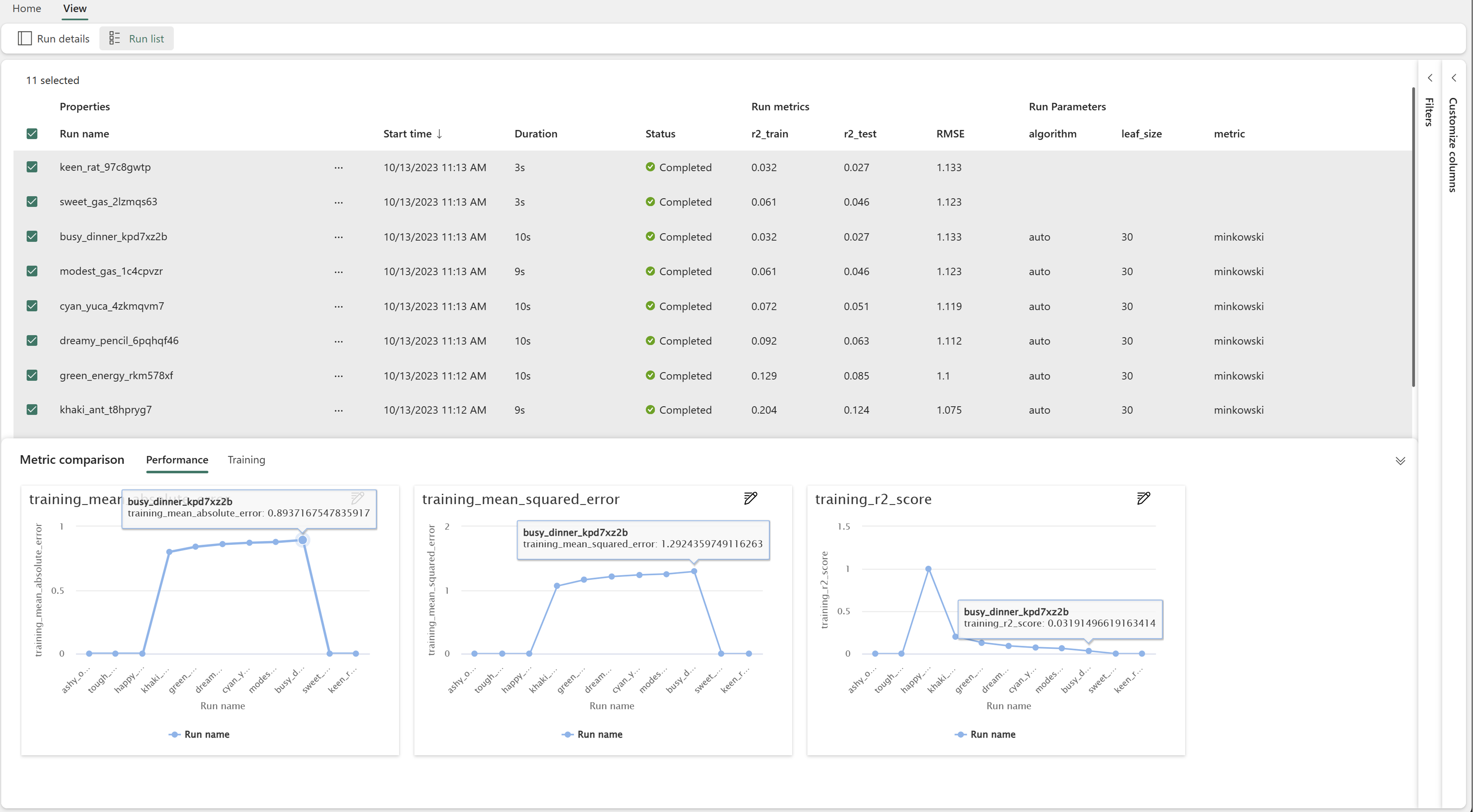 To compare and evaluate the quality of your machine learning runs, you can compare the parameters, metrics, and metadata between selected runs within an experiment.