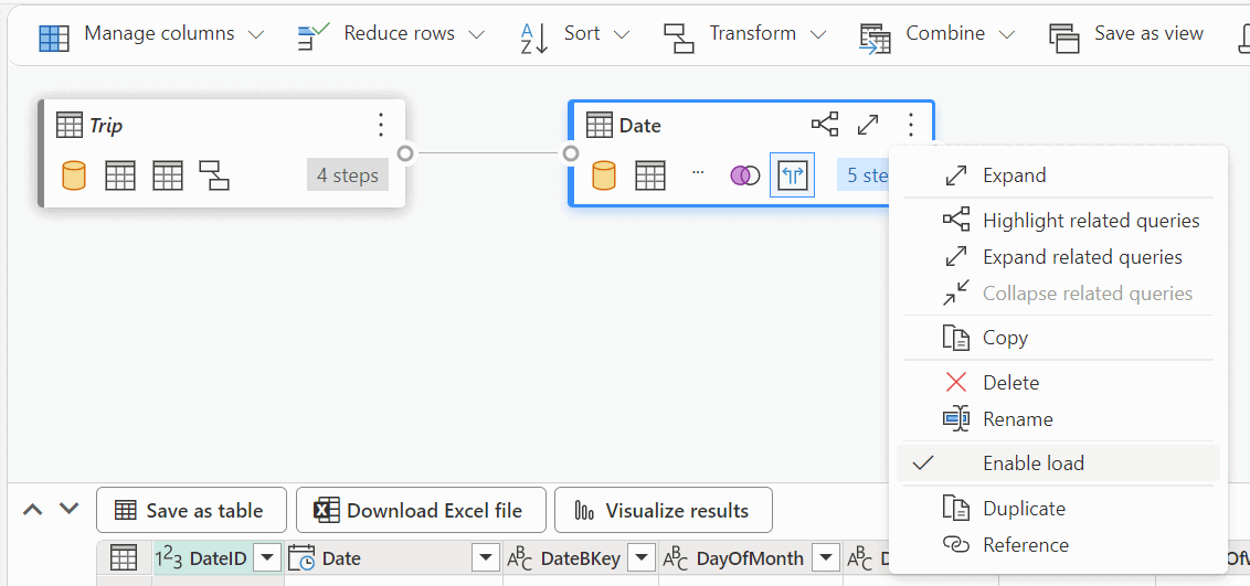 When writing queries that are joining two or more tables using the Merge queries action, the query that has load enabled will be reflected in the SQL script. To specify which table's query should be shown in the SQL script, select the context menu and then Enable load. Expand the table's columns that got merged in the results to see the steps reflected in the SQL script.