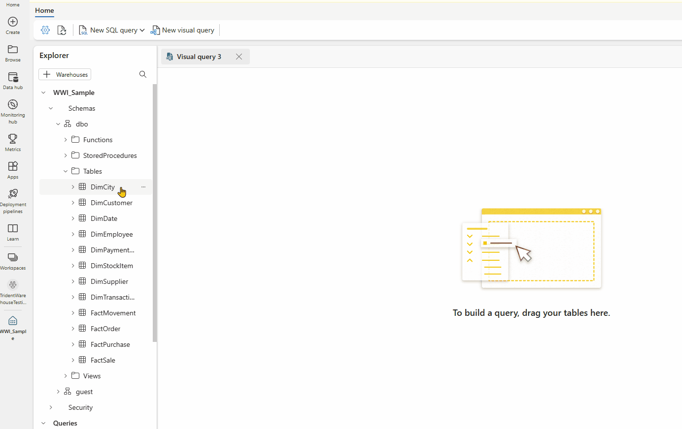 To create a query, drag and drop tables from the Object explorer onto the canvas. To drag a table, select and hold the table until you see it's picked up from the Object explorer before dragging. Once you drag one or more tables onto the canvas, you can use the visual experience to design your queries. The warehouse editor uses the Power Query diagram view experience to enable you to easily query and analyze your data. Learn more about Power Query diagram view.