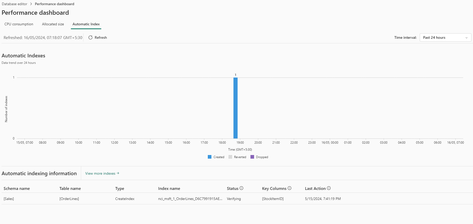The Automatic index tab report shows a history and status of automatically created indexes.