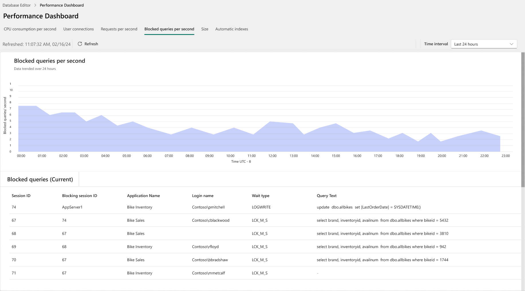 The Blocked queries per second graph tracks queries experience blocks due to locking. The Blocked queries (current) table shows the set of blocked queries at any given point in time.