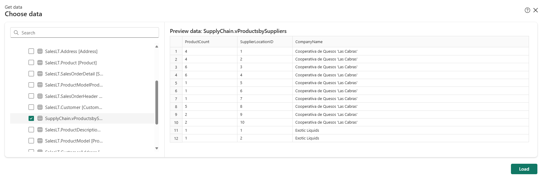 SupplyChain.vProductsBySuppliers, the view you created earlier in this tutorial. Select it.Select the Load button.