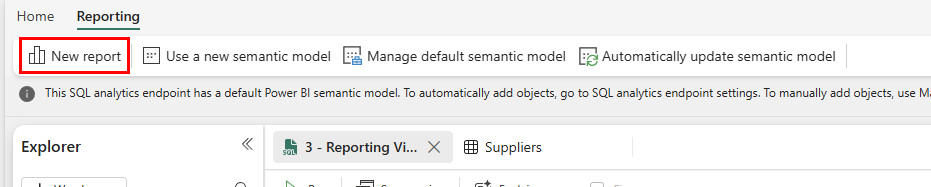 Inside the SQL analytics endpoint view, you have a menu option for Reporting. You'll now create a report based on the views you created in the SQL analytics endpoint in a previous tutorial step.