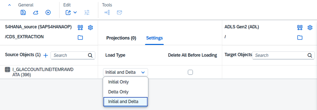 Configure the detail settings for the replication. Select Settings in the middle section of the canvas. Check and adjust the selected Load Type if needed. Currently, mirroring supports Initial and Delta or Initial Only.