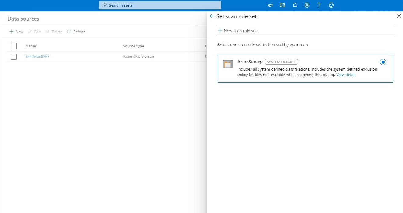 System scan rule sets are Microsoft-defined scan rule sets that are automatically created for each Microsoft Purview catalog. Each system scan rule set is associated with a specific data source type. When you create a scan, you can associate it with a system scan rule set. Every time Microsoft makes an update to these system rule sets, you can update them in your catalog, and apply the update to all the associated scans.