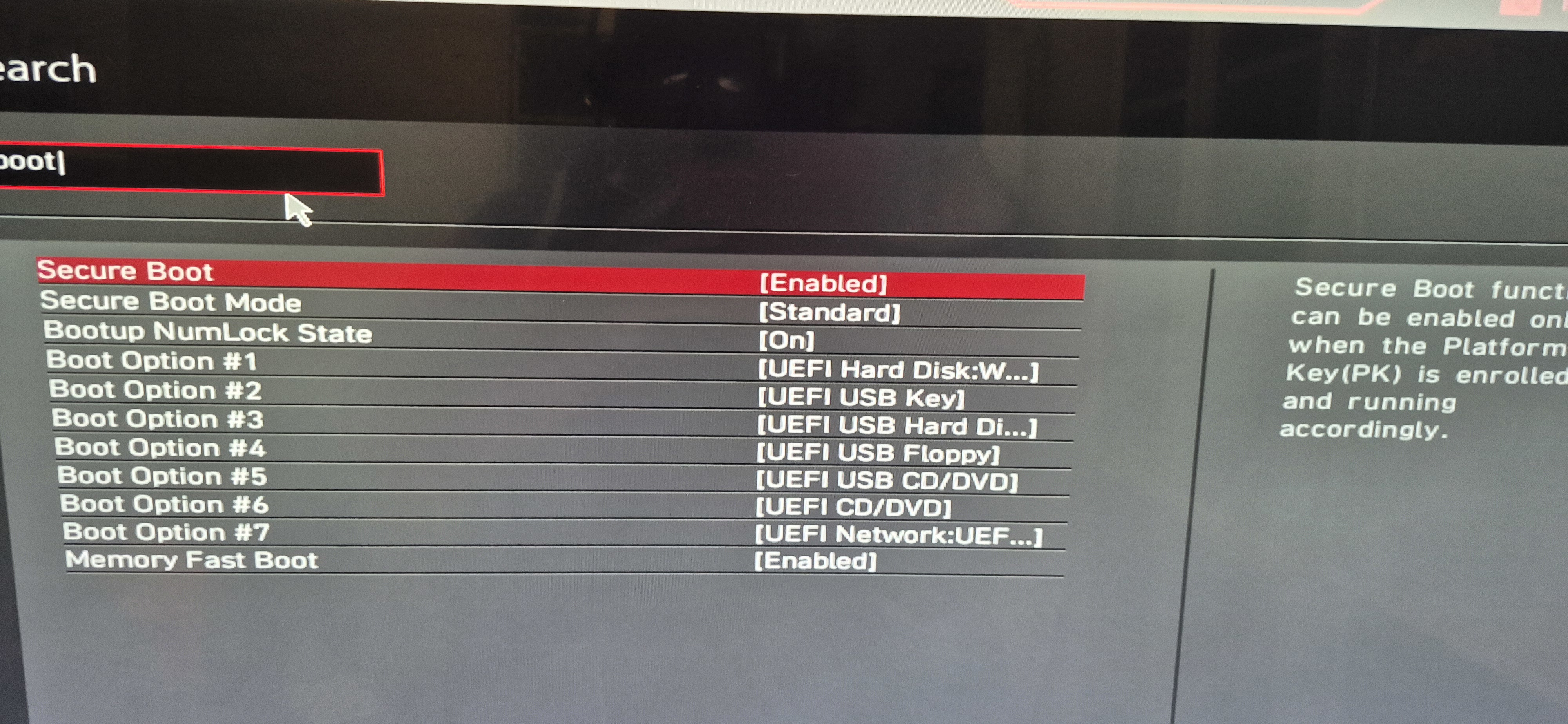 When you enable secure boot, take a picture of the boot sequence tab and post it here.