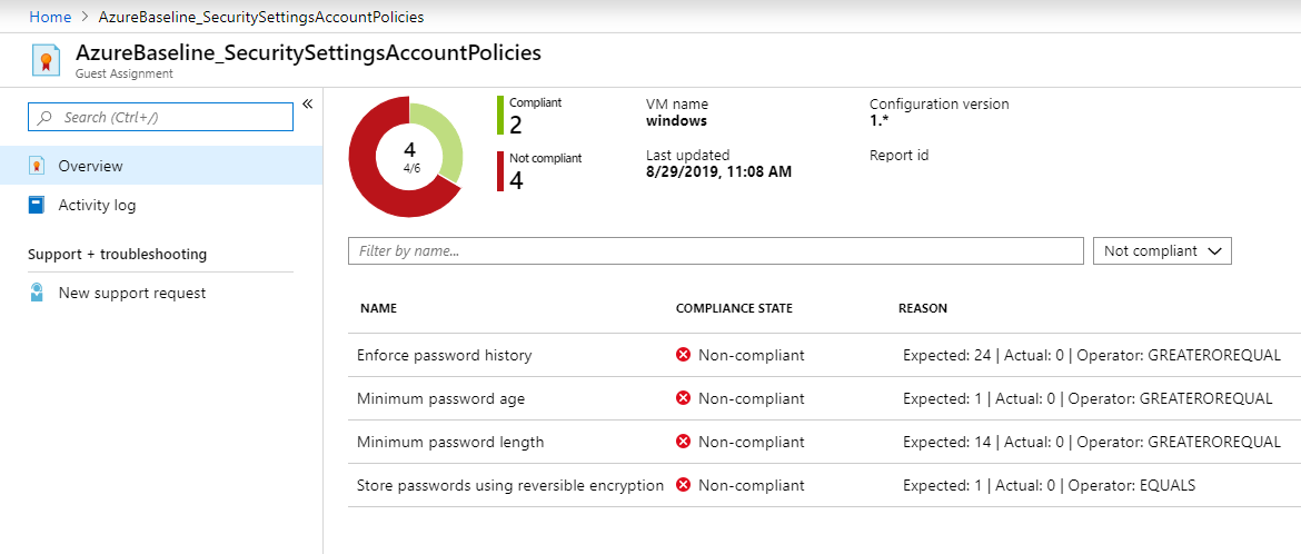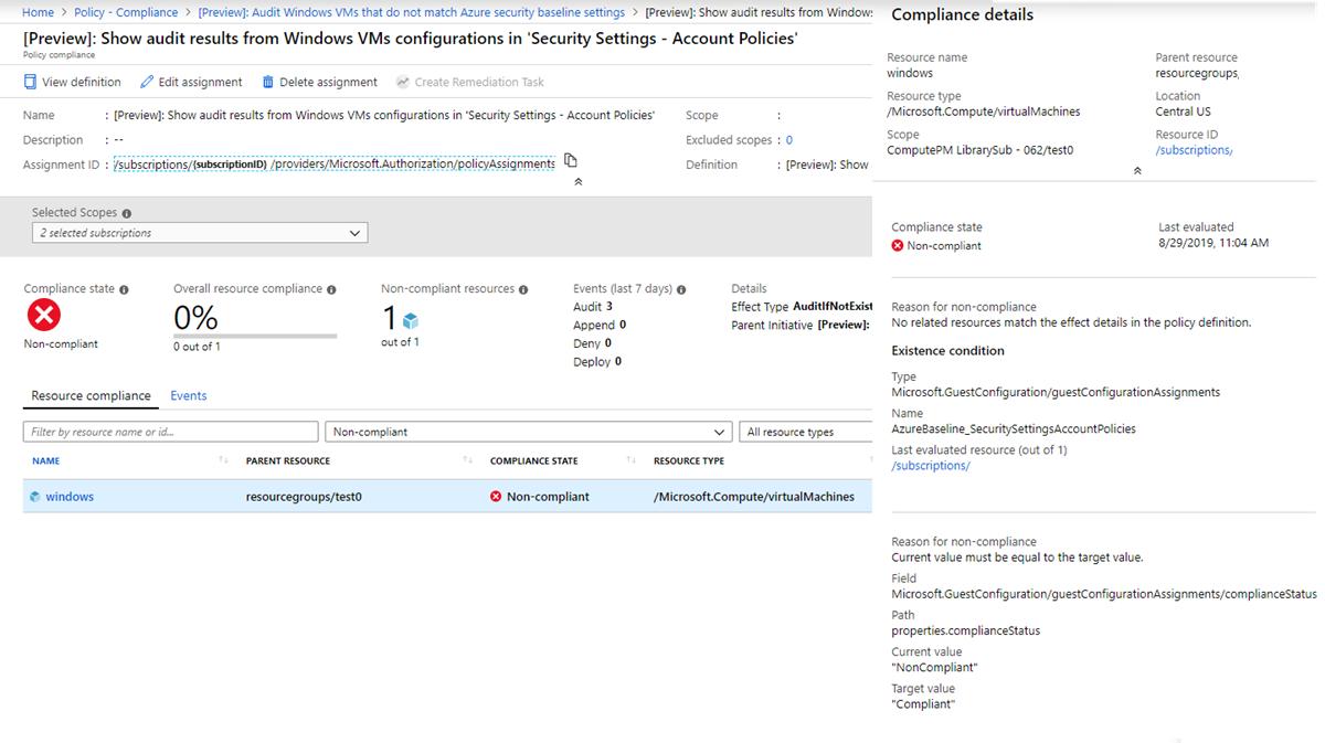 For policy definitions in the Guest Configuration category, there could be multiple settings evaluated inside the virtual machine and you need to view per-setting details. For example, if you're auditing for a list of security settings and only one of them has status Non-compliant, you need to know which specific settings are out of compliance and why.