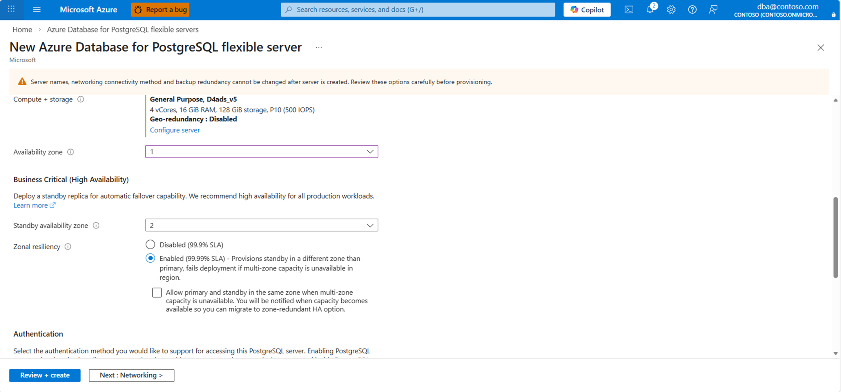 - After you create the new server, enable high availability with zone redundancy.