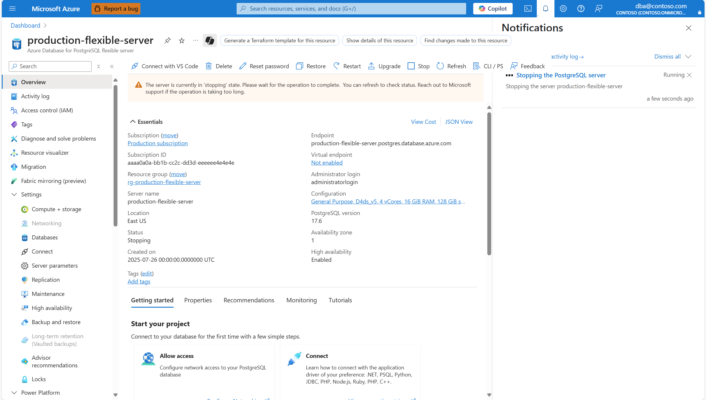 Once the server is stopped, other management operations aren't available for the Azure Database for PostgreSQL flexible server. While the Azure Database for PostgreSQL flexible server is in stopped state, it could be briefly restarted for scheduled monthly maintenance, and then returned to its stopped state. This procedure ensures that even instances in a stopped state, stay up to date with all necessary patches and updates.