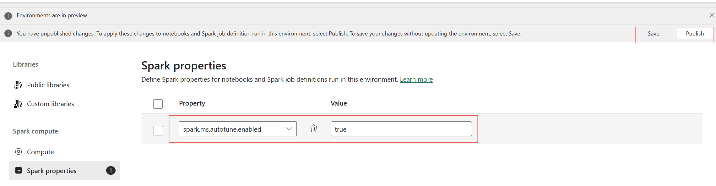 Autotune is available across all production regions but is disabled by default. You can activate it through the Spark configuration setting within the environment. To enable autotune, either create a new environment or, for the existing environment, set the Spark property 'spark.ms.autotune.enabled = true' as shown in the screenshot below. This setting is then inherited by all notebooks and jobs running in that environment, automatically tuning them.