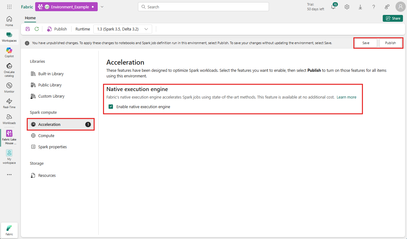 Previously, the native execution engine was enabled through Spark settings within the environment configuration. The native execution engine can now be enabled more easily using a toggle in the Acceleration tab of the environment settings. To continue using it, go to the Acceleration tab and turn on the toggle. You can also enable it via Spark properties if preferred.