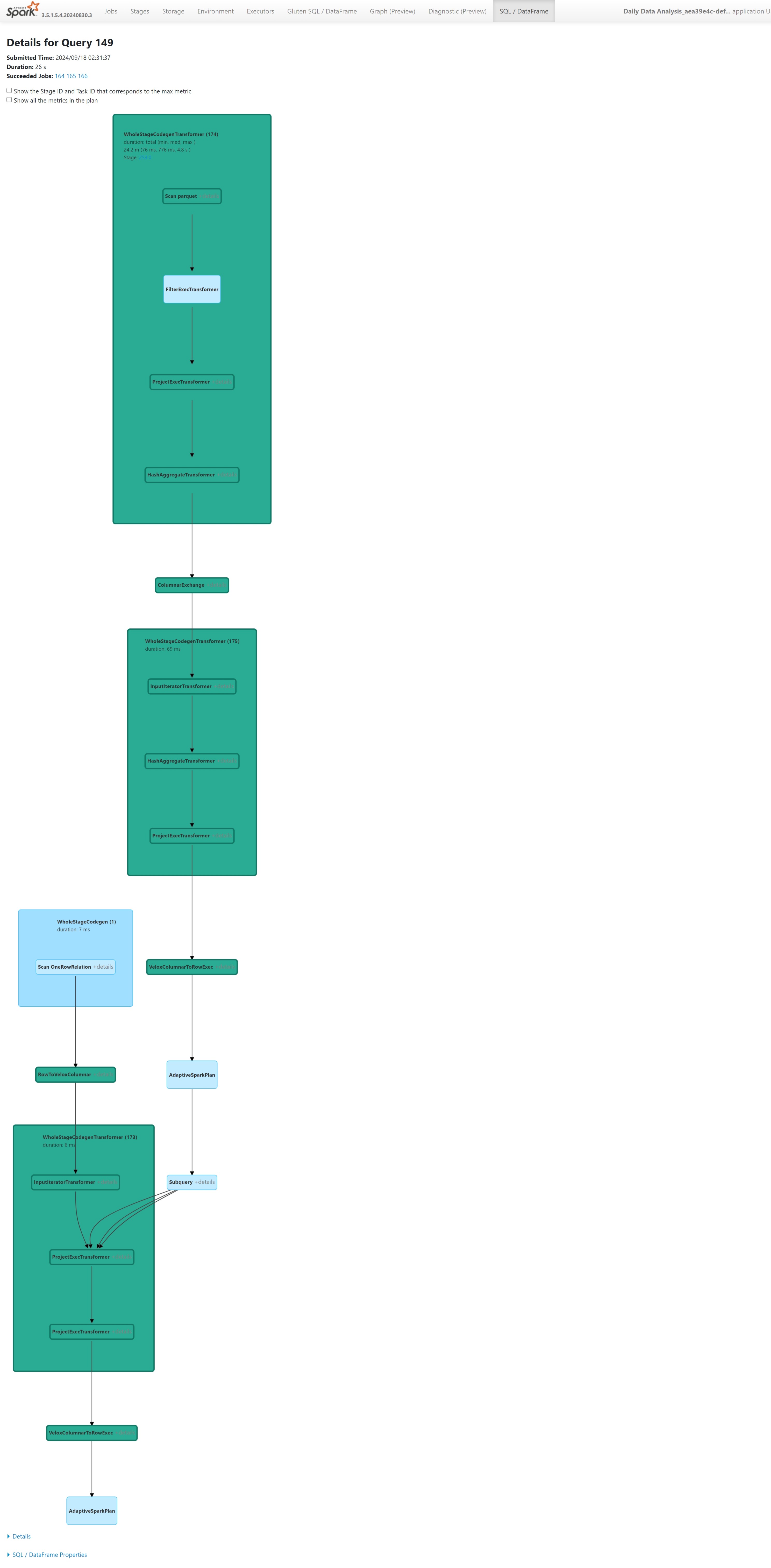 You can also select on the query description for the Apache Spark query execution plan visualization. The execution graph provides native execution details across stages and their respective operations. Background colors differentiate the execution engines: green represents the Native Execution Engine, while light blue indicates that the operation is running on the default JVM Engine.