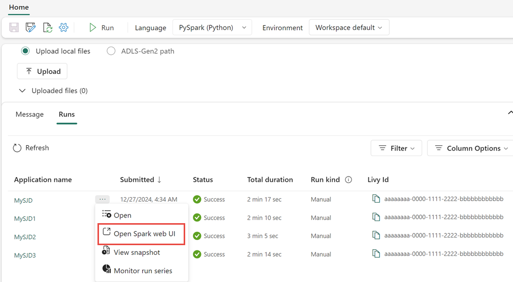 Access the Spark UI or Spark history server to locate the query you need to inspect. To access the Spark web UI, navigate to your Spark Job Definition and run it. From the Runs tab, select the ... next to the Application name and select Open Spark web UI. You can also access the Spark UI from the Monitor tab in the workspace. Select the notebook or pipeline, from the monitoring page, there's a direct link to the Spark UI for active jobs.