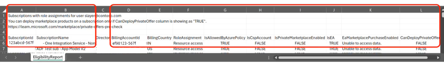 The eligibility report provided is a CSV file containing a comprehensive list of your subscriptions along with their deployment status (whether they can or can't deploy Marketplace purchases). You'll need to find the subscription to use, and the associated Billing Account ID listed.
