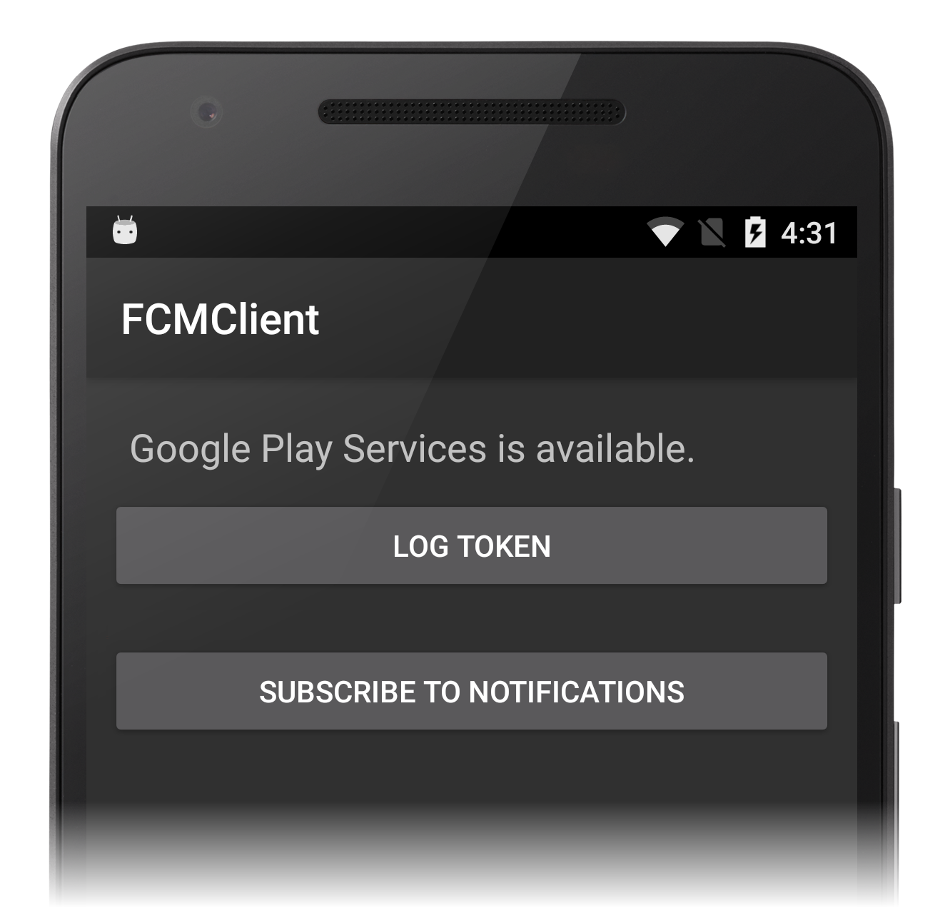 In this walkthrough, a basic app called FCMClient will be created to illustrate the essentials of FCM messaging. FCMClient checks for the presence of Google Play Services, receives registration tokens from FCM, displays remote notifications that you send from the Firebase Console, and subscribes to topic messages: