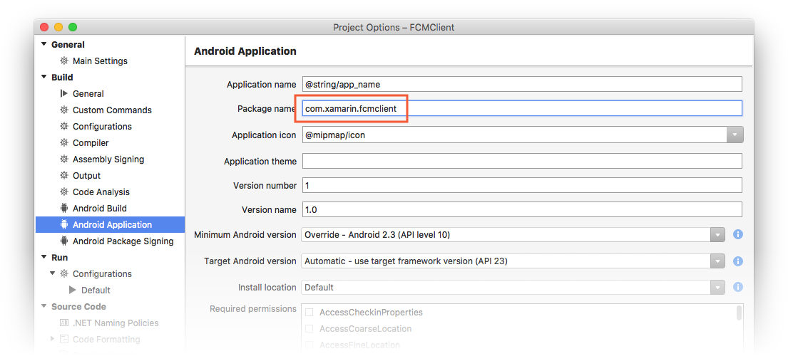 In the following example, the package name is set to com.xamarin.fcmexample: