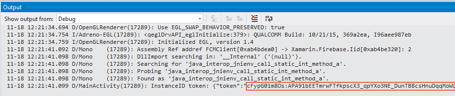 Copy the token string from the IDE output window and paste it into the FCM registration token field of the Firebase Console as before.