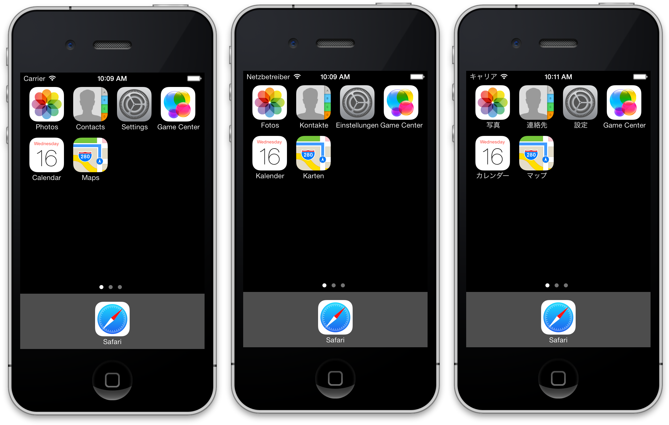 Compare the string lengths for a few items on the iOS home screen in English, German, and Japanese:
