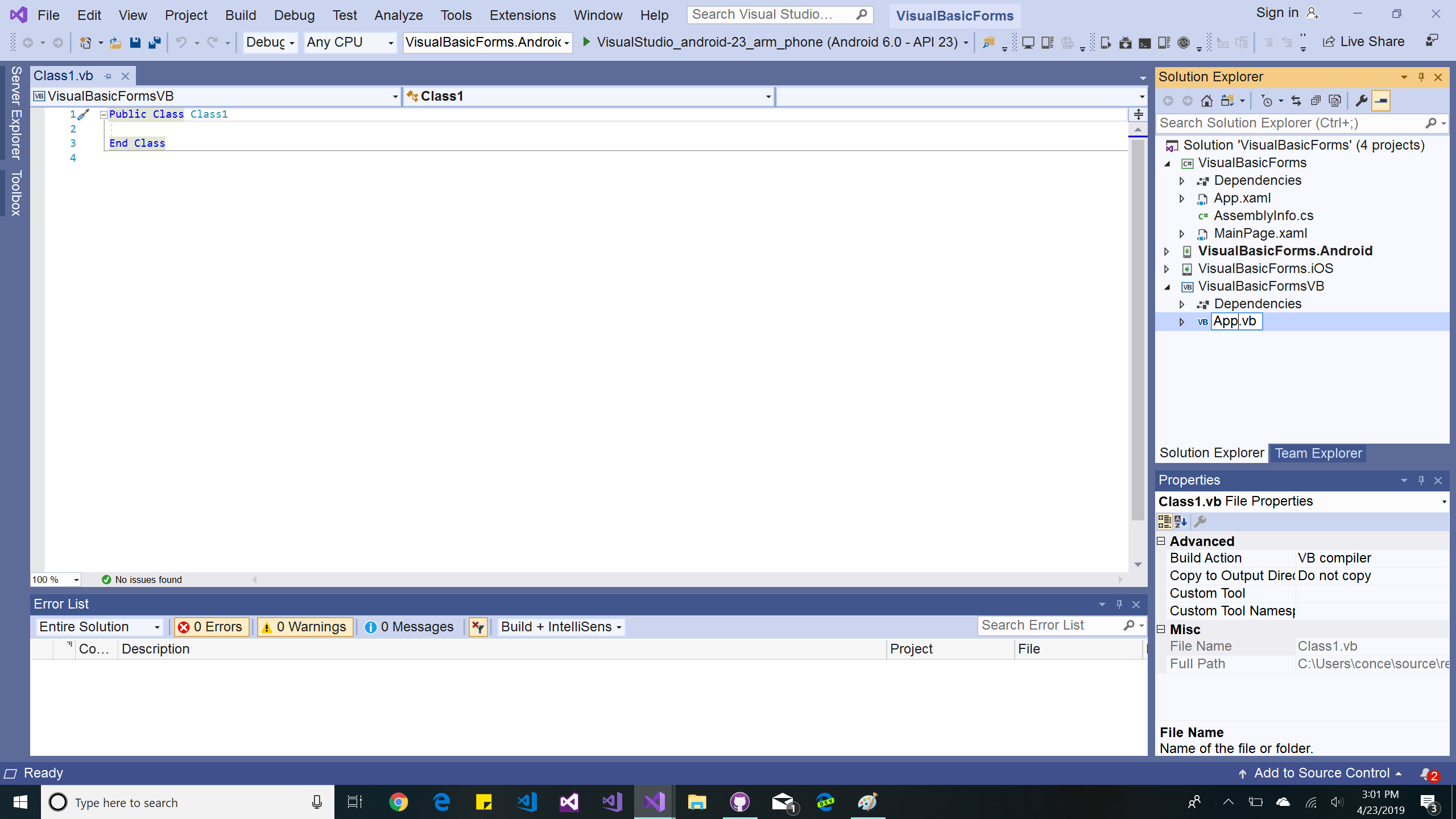 This creates a Xamarin.Forms solution in Visual Studio, using C#. The next steps modify the solution to use Visual Basic.
