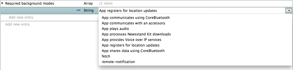 Applications can be registered by setting the Required Background Modes property in the application's Info.plist. An application can register in as many categories as it requires: