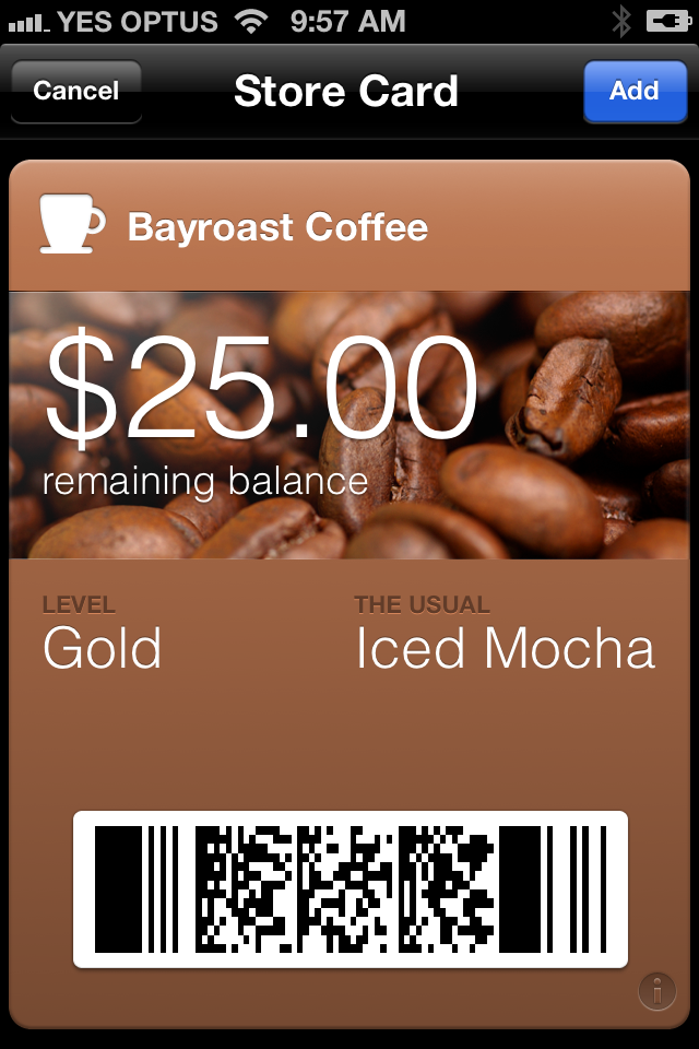 - Loyalty cards – Rather than (or in addition to) providing a physical card, stores can issue (via email or after a website login) a Store Card Pass. The store can provide additional features such as updating the balance of the account on the pass via push notifications, and using geolocation services the pass could automatically appear on the lock-screen when the customer is near a store location.