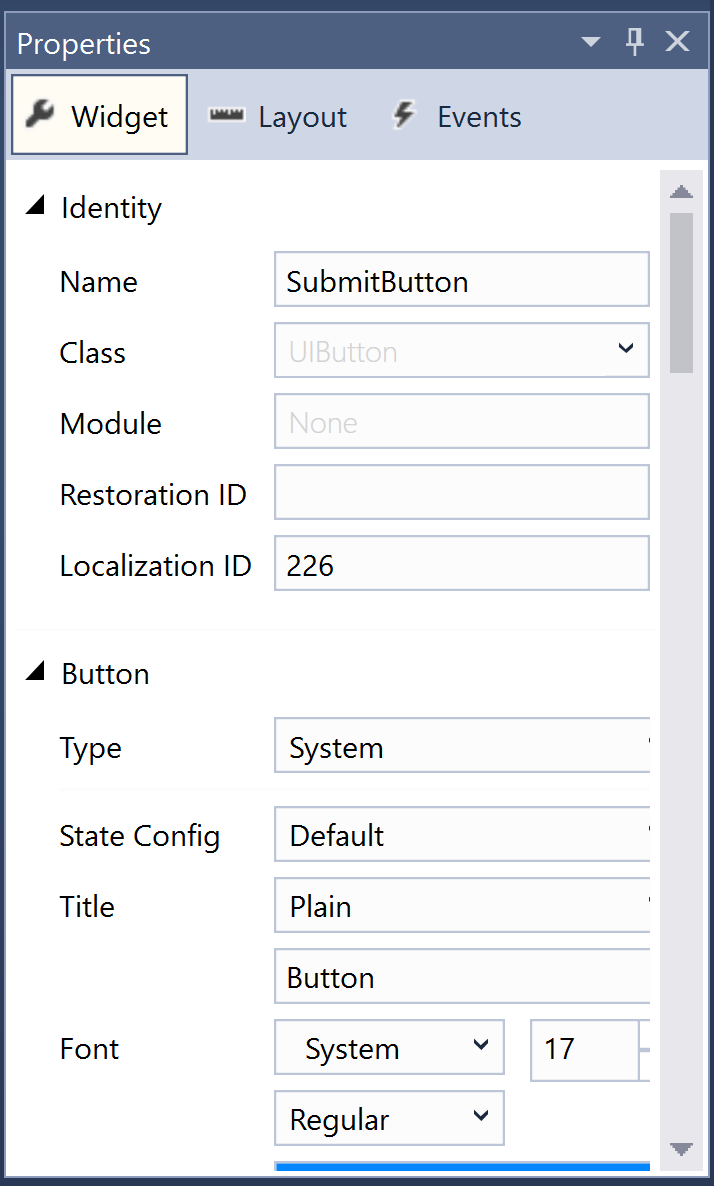 - Layout – Properties that keep track of the position and size of the control, including constraints and frames, are listed here.