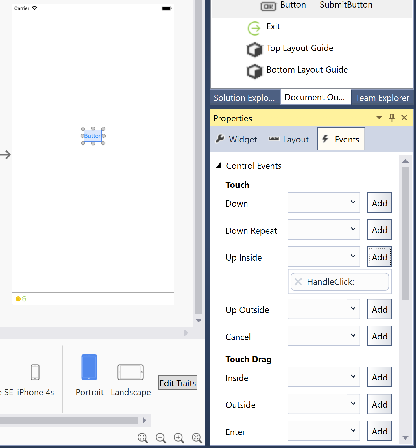 To specify custom event handlers for various events, use the Events tab of the Properties Pad. For example, in the screenshot below, a HandleClick method handles the button's Touch Up Inside event: