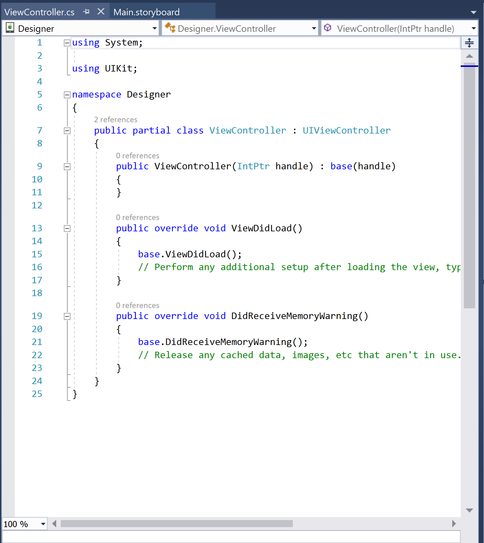 ViewControllerclass. In this file, theViewControllerclass can respond to various iOS view controller lifecycle methods, customize the UI, and respond to user input such as button taps.ViewController.designer.cs is a generated file, created by the iOS Designer to map the visually-constructed interface to code. Since changes to this file will be overwritten, it should not be modified. Property declarations in this file make it possible for code in the