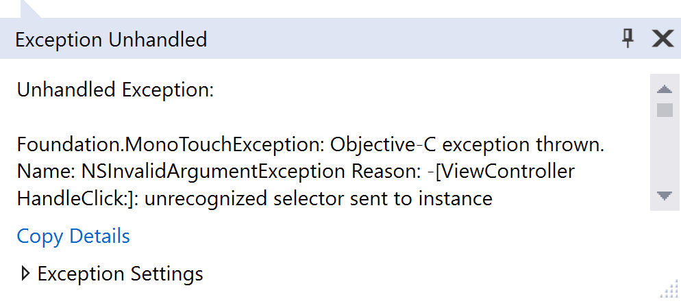 Once an event handler has been specified, a method of the same name must be added to the corresponding view controller class. Otherwise, an unrecognized selector exception will occur when the button is tapped: